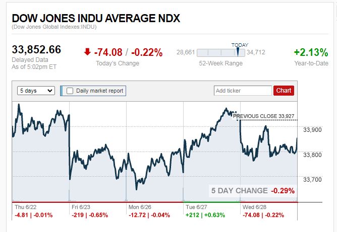 ดาวโจนส์ปิดที่ 33,852.66 จุด ลดลง 74.08 จุด หรือ -0.22%