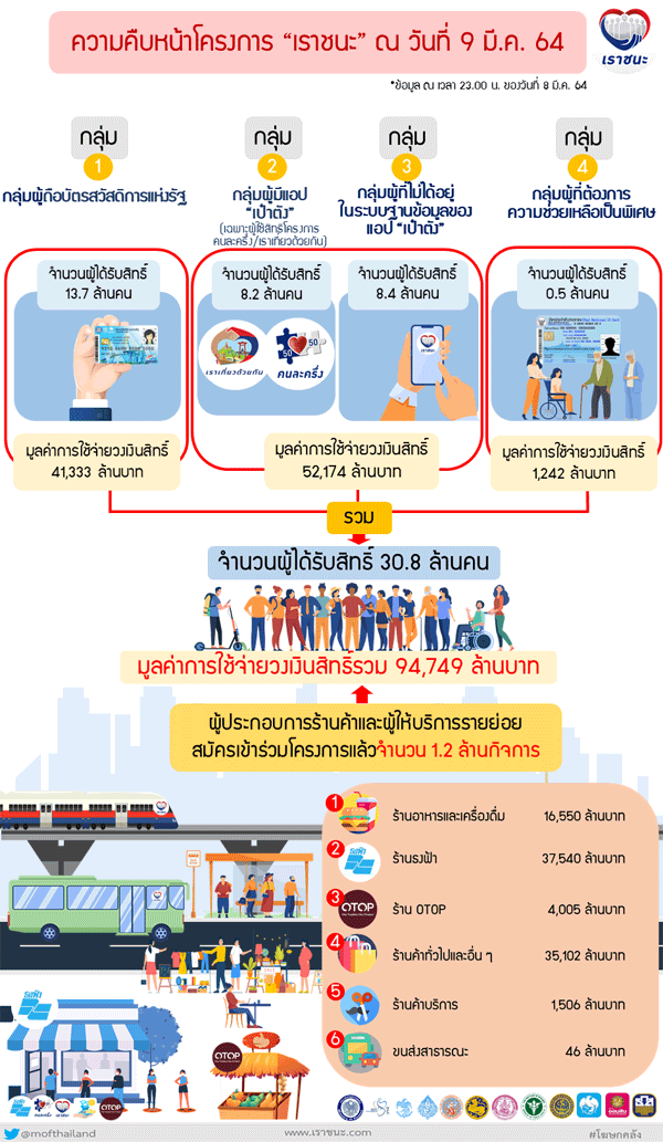 กระทรวงการคลัง เผย เราชนะใช้จ่ายแล้ว 94,749 ล้านบาท มีผู้ได้รับสิทธิ์แตะ 30.8 ล้านคน ร้านค้าเข้าร่วมกว่า 1.2 ล้านกิจการ