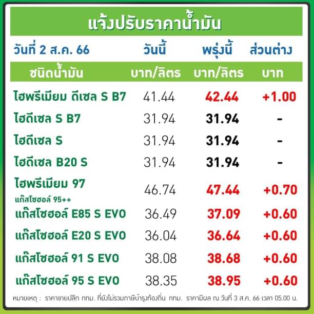 บริษัท ปตท.น้ำมันและการค้าปลีก จำกัด (มหาชน) (OR) และ บริษัท บางจาก คอร์ปอเรชั่น จำกัด (มหาชน) (BCP) ประกาศปรับขึ้นราคาขายปลีกน้ำมันกลุ่มเบนซินและแก๊สโซฮอล์ทุกชนิด และพรีเมี่ยมดีเซล B7 เพิ่มขึ้น 60 สต./ลิตร กลุ่มดีเซลคงเดิม มีผล 3 สิงหาคม 2566 ตั้งแต่เวลา 05.00 น. เป็นต้นไป