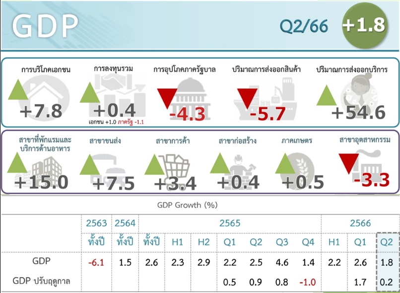 สศช. เผย เศรษฐกิจไทยไตรมาส 2 ปี 66 โต 1.8% ต่ำกว่าคาด พร้อมปรับเป้าทั้งปีโต 2.5-3% ชี้ 3 ปัจจัยเสี่ยง จับตาใกล้ชิด