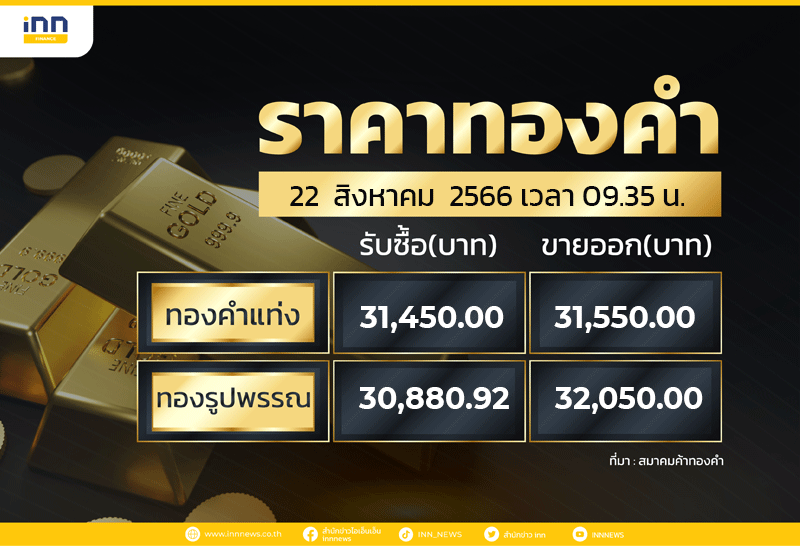 สมาคมค้าทองคำ ประกาศราคาซื้อ-ขายทอง ประจำวันอังคารที่ 22 สิงหาคม 2566 ครั้งที่ 1 เมื่อเวลา 09.35 น.ราคาปรับลง 50 บาท จากราคาวานนี้