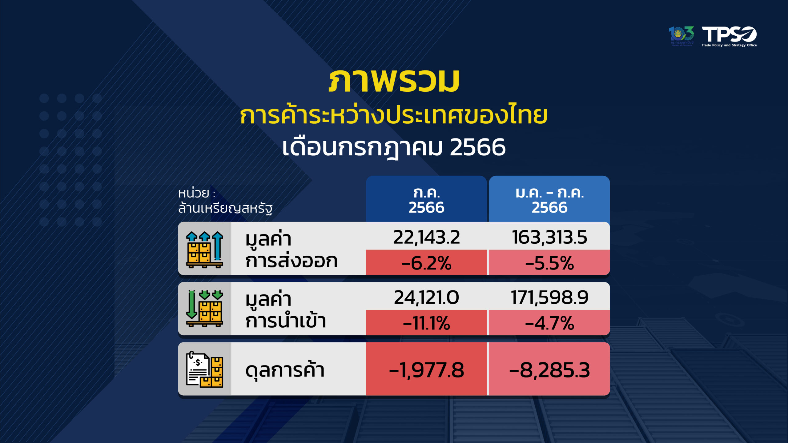 พาณิชย์เผยความต้องการตลาดโลกลดลง,ดอกเบี้ยสูงฉุดส่งออกเดือน ก.ค. ลบ6.2%,7ด.-5.5% เชื่อระยะถัดจากนี้จะดีขึ้น