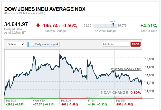 บรรยากาศการลงทุนในตลาดหุ้นสหรัฐ (5 ก.ย.) ดาวโจนส์ปิดลบโดยตลาดถูกกดดันจากการพุ่งขึ้นของอัตราผลตอบแทนพันธบัตรสหรัฐ ขณะที่นักลงทุนประเมินทิศทางอัตราดอกเบี้ยของธนาคารกลางสหรัฐ (เฟด) และจับตาข้อมูลเงินเฟ้อสหรัฐอย่างใกล้ชิด ก่อนที่การประชุมเฟดจะมีขึ้นในวันที่ 19-20 ก.ย.นี้