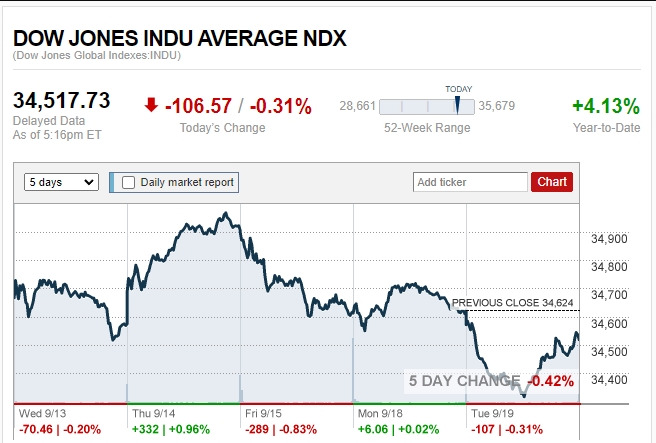 บรรยากาศการลงทุนในตลาดหุ้นสหรัฐ (19 ก.ย.) ดาวโจนส์ปิดลบ เนื่องจากนักลงทุนเทขายหุ้นเพื่อลดความเสี่ยง ก่อนที่จะรู้ผลการประชุมนโยบายการเงินของธนาคารกลางสหรัฐ (เฟด) ในวันพุธ (20 ก.ย.) ตามเวลาสหรัฐ
