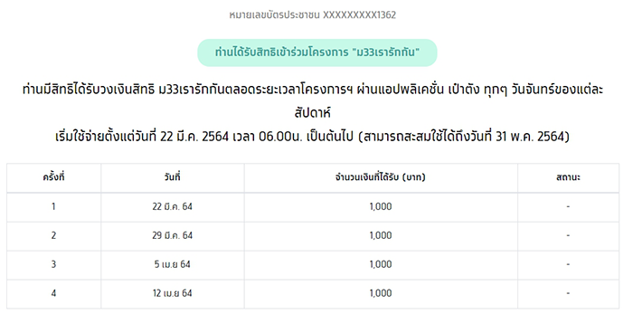 ทั้งนี้ ถ้าตรวจพบว่าได้รับสิทธิแล้ว ให้เข้าไปยืนยันตัวตนผ่านแอปเป๋าตัง ตั้งแต่วันที่ 15 มี.ค. – 31 พ.ค.นี้ โดยเงินจะเข้าวันที่ 22 , 29 มี.ค. และ 5 , 12 เม.ย. ครั้งละ 1,000 บาท แต่หากยืนยันตัวตน ช่วง 22 มี.ค. – 11 เม.ย. จะได้รับเงินครั้งแรก 29 มี.ค. จำนวน 2,000 บาท และส่วนที่เหลือทยอยโอนครั้งละ 1,000 บาท