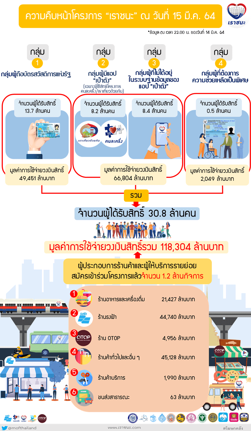 กระทรวงการคลัง เผย เราชนะ ใช้จ่ายหมุนเวียนในระบบเศรษฐกิจแล้ว กว่า 1.18 แสนล้านบาท รับสิทธิ์เพิ่ม 19 มี.ค. ขณะ คนละครึ่ง 9.67 หมื่นล้านบาท