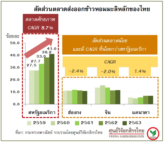 ดังนั้น ข้าวหอมมะลิจึงน่าจะเป็นตลาดที่ไทยทำได้ดีที่สุดหรือมีความสามารถในการแข่งขันส่งออกมากที่สุด และเป็นตลาดพรีเมียมที่ไม่ได้แข่งขันด้านราคา สุดท้าย จะทำให้ไทยยังคงประคองตัวเลขการส่งออกข้าวไว้ได้มากกว่าปีก่อนและสามารถรักษาส่วนแบ่งตลาดข้าวในโลกไว้ได้ใกล้เคียงกับปีก่อนที่ราวร้อยละ 12.8