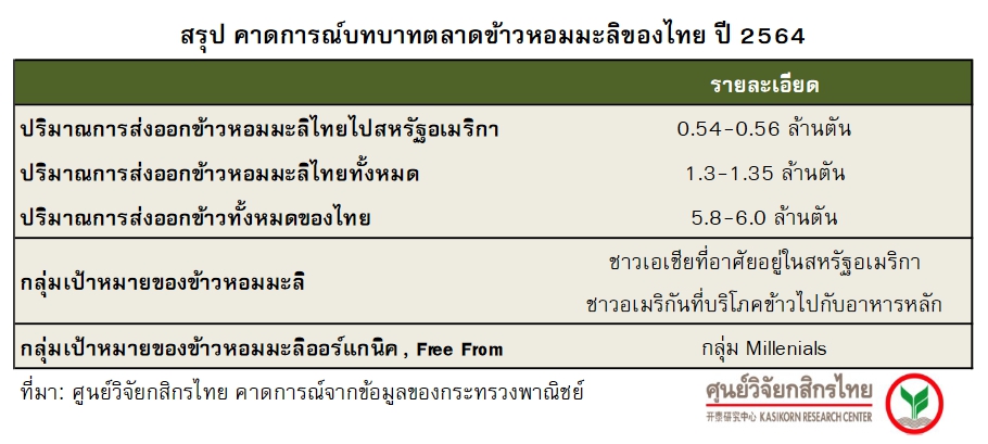 สำหรับในปี 2564 ศูนย์วิจัยกสิกรไทย มองว่า ภาพการส่งออกข้าวของไทยน่าจะสามารถประคองตัวต่อไปได้ที่ราว 5.8-6 ล้านตัน หรือเพิ่มขึ้นร้อยละ 1.3-4.8 (YoY) ซึ่งเป็นอัตราที่สูงกว่าการเติบโตของความต้องการข้าวทั้งหมดในตลาดโลกที่ร้อยละ 1.7 โดยมีตัวผลักดันจากข้าวหอมมะลิที่ส่งออกไปสหรัฐอเมริกามีการเติบโตได้เป็นอย่างดี ขณะที่ตลาดข้าวประเภทอื่น (ข้าวขาว ข้าวนึ่ง) คาดว่าอาจทำได้เพียงมีการเติบโตเท่ากับความต้องการข้าวทั้งหมดในตลาดโลกเท่านั้น