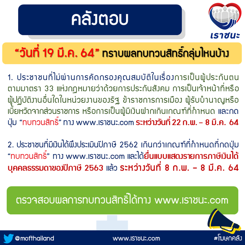 เราชนะ ประกาศผลทบทวนสิทธิ์ รอบสองพรุ่งนี้ ขณะ ได้รับสิทธิ์แล้ว 32.4 ล้านคน เงินหมุนเวียนในระบบเศรษฐกิจกว่า 124,105 ล้านบาท