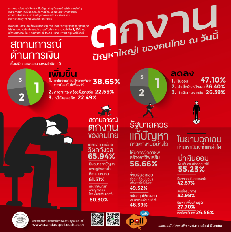 “สวนดุสิตโพล” มหาวิทยาลัยสวนดุสิต เปิดเผยสำรวจความคิดเห็นเรื่อง “ตกงาน ปัญหาใหญ่! ของคนไทย ณ วันนี้” จากการสอบถามประชาชน จำนวนทั้งสิ้น 1,155คน (สำรวจทางออนไลน์) ระหว่างวันที่ 15-18 มี.ค.ที่ผ่านมา พบว่า ประชาชนร้อยละ 65.94 เกิดความเครียด วิตกกังลกับ สถานการณ์ “ตกงาน” ของคนไทย ณ วันนี้, ร้อยละ 61.51 มองมีผลมาจากปัญหาเศรษฐกิจตกต่ำที่สะสมมานาน, ร้อยละ 60.30 ก่อให้เกิด ปัญหาอาชญากรรม โจร ขโมย เพิ่มมากขึ้น และ ร้อยละ 59.25 การระบาดของโควิด-19 ทำให้คนตกงาน