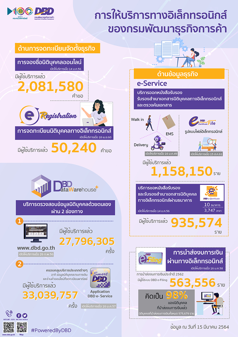 นายทศพล ทังสุบุตร อธิบดีกรมพัฒนาธุรกิจการค้า กระทรวงพาณิชย์ เปิดเผยว่า ปัจจุบัน การใช้บริการของกรมฯ ผ่านช่องทางออนไลน์มีจำนวนเพิ่มขึ้นแบบก้าวกระโดด ทั้งการจดทะเบียนจัดตั้งธุรกิจ การจองชื่อนิติบุคคลออนไลน์ ซึ่งเป็นขั้นตอนแรกก่อนเข้าสู่การจัดตั้งนิติบุคคล เปิดให้บริการเมื่อวันที่ 14 มกราคม 2556 มีผู้ใช้บริการแล้ว 2,081,580 คำขอ ด้านข้อมูลธุรกิจ มีบริการที่สามารถเข้าใช้งานผ่านหลายช่องทาง ทั้ง บริการออกหนังสือรับรอง รับรองสำเนาเอกสารนิติบุคคลทางอิเล็กทรอนิกส์ การตรวจค้นเอกสาร และสำหรับบริการนำส่งงบการเงินทางอิเล็กทรอนิกส์ หรือ DBD e-Filing การนำส่งงบการเงินประจำปี 2562 มีผู้ใช้ระบบนี้มากถึง 563,556 ราย คิดเป็นร้อยละ 98 ของนิติบุคคลที่นำส่งงบการเงินทั้งหมด