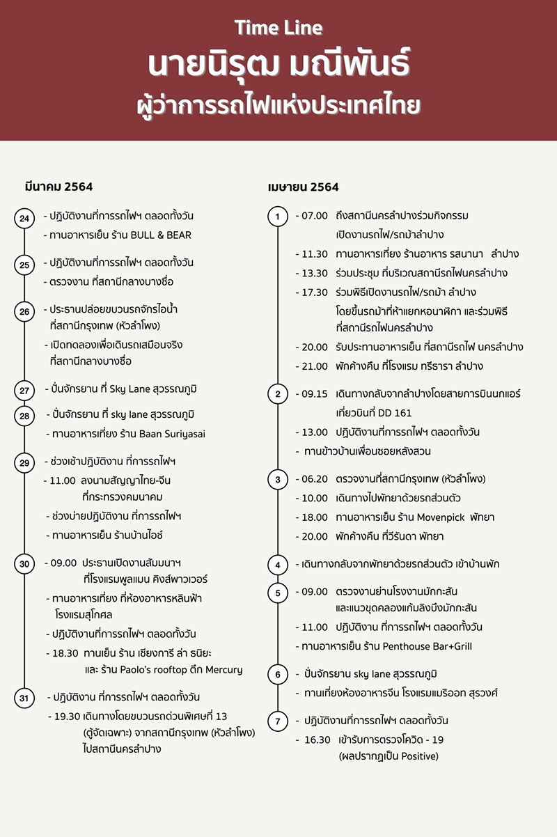 ทั้งนี้ ผู้ว่าการรถไฟฯ ได้มีการแจ้งไทม์ไลน์ระหว่างวันที่ 24 มีนาคม – 7 เมษายน 2564 โดยยืนยันว่าไม่เคยเดินทางไปสถานบันเทิงย่านทองหล่อตามที่มีผู้กล่าวอ้างแต่อย่างใด ซึ่งปัจจุบันนายนิรุฒอยู่ระหว่างการเข้ารับการงรักษาตามขั้นตอนและกระบวนการที่ถูกต้องทางการแพทย์