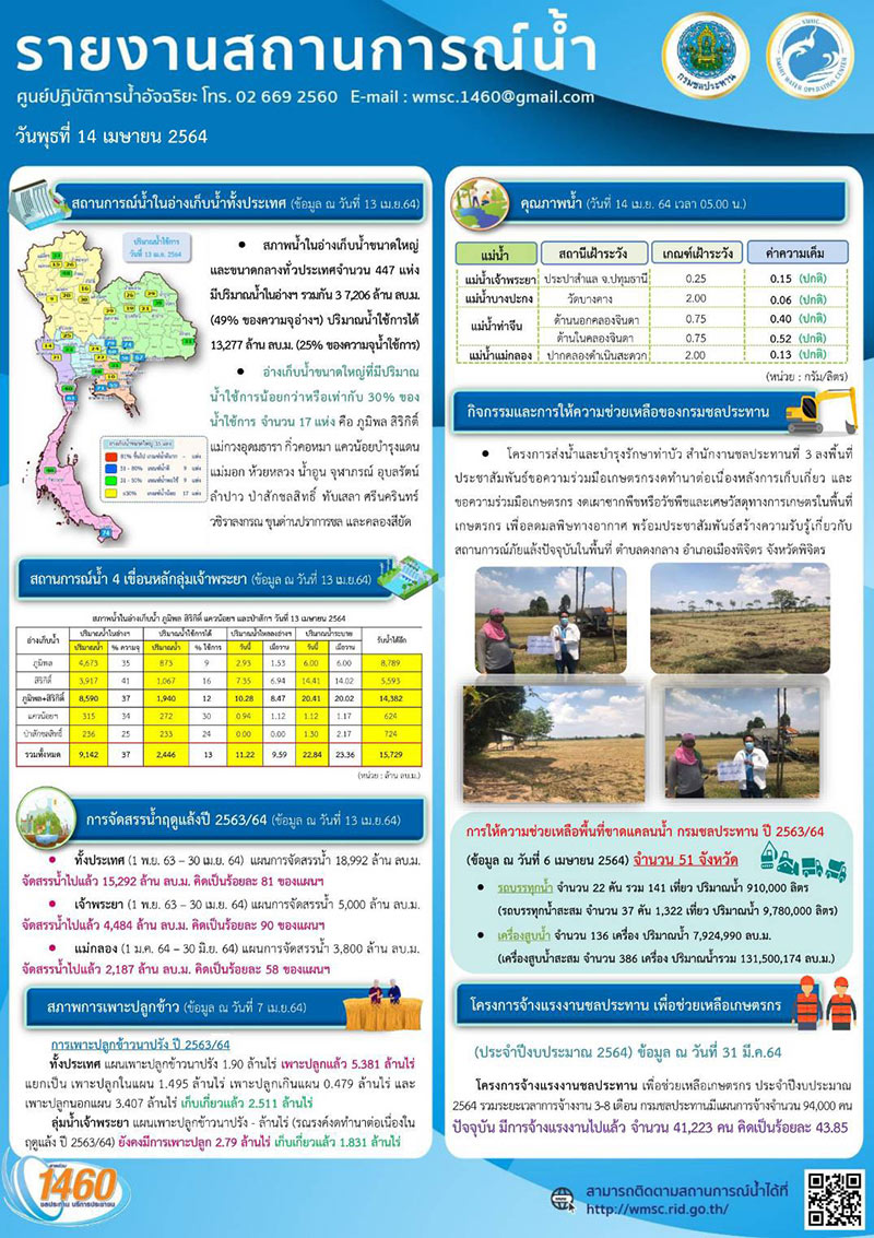 ดร.ทวีศักดิ์ ธนเดโชพล รองอธิบดีกรมชลประทาน เปิดเผยว่า ข้อมูล ณ วันที่ 14 เม.ย. 64 สถานการณ์น้ำในอ่างเก็บน้ำขนาดใหญ่และขนาดกลางทั่วประเทศ มีปริมาณน้ำรวมกัน 37,206 ล้าน ลบ.ม. คิดเป็น 49% ของความจุอ่างรวมกัน เป็นปริมาณน้ำใช้การได้ประมาณ 13,277 ล้าน ลบ.ม. มีอ่างเก็บน้ำขนาดใหญ่ที่มีปริมาณน้ำใช้การได้น้อยกว่า30% อยู่ 17 แห่ง ประกอบด้วย ภูมิพล สิริกิติ์ แม่กวงฯ กิ่วคอหมา แควน้อยฯ แม่มอก ห้วยหลวง น้ำอูน จุฬาภรณ์ อุบลรัตน์ ลำปาว ป่าสักฯ ทับเสลา ศรีนครินทร์ วชิราลงกรณ์ขุนด่านฯ และคลองสียัด