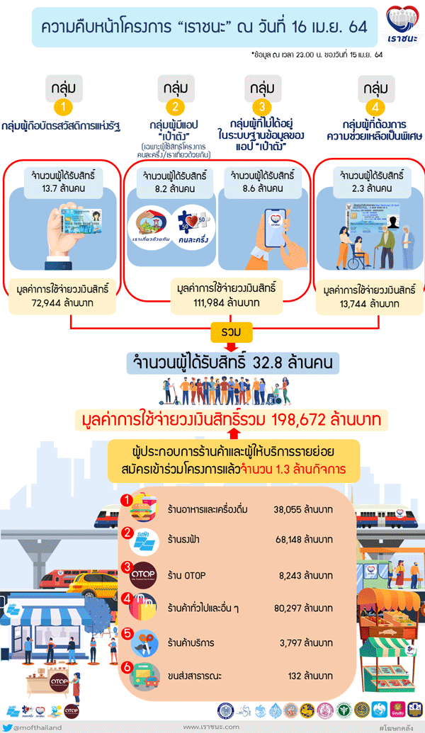 นางสาวกุลยา ตันติเตมิท ผู้อำนวยการสำนักงานเศรษฐกิจการคลัง ในฐานะโฆษกกระทรวงการคลังเปิดเผยถึงความคืบหน้าของโครงการเราชนะ ณ วันที่ 16 เมษายน 2564 ว่ามีประชาชนกลุ่มผู้ถือบัตรสวัสดิการแห่งรัฐ จำนวน 13.7 ล้านคน ได้มีการใช้จ่าย 72,944 ล้านบาท ประชาชนกลุ่มที่อยู่ในระบบฐานข้อมูลของแอปพลิเคชัน “เป๋าตัง” จำนวน 16.8 ล้านคน ใช้จ่าย 111,984 ล้านบาท และประชาชนกลุ่มผู้ที่ต้องการความช่วยเหลือเป็นพิเศษที่ผ่านการคัดกรองคุณสมบัติแล้ว จำนวน 2.3 ล้านคน มียอดใช้จ่าย 13,744 ล้านบาท ทำให้มีผู้ได้รับสิทธิ์ในโครงการฯ แล้ว รวมทั้งสิ้นจำนวน 32.8 ล้านคน คิดเป็นมูลค่าการใช้จ่ายหมุนเวียนในระบบเศรษฐกิจไทยแล้วกว่า 198,672 ล้านบาท รวมถึงผู้ประกอบการร้านค้าและผู้ให้บริการที่ลงทะเบียนเข้าร่วมโครงการฯ จำนวนทั้งสิ้นมากกว่า 1.3 ล้านกิจการ