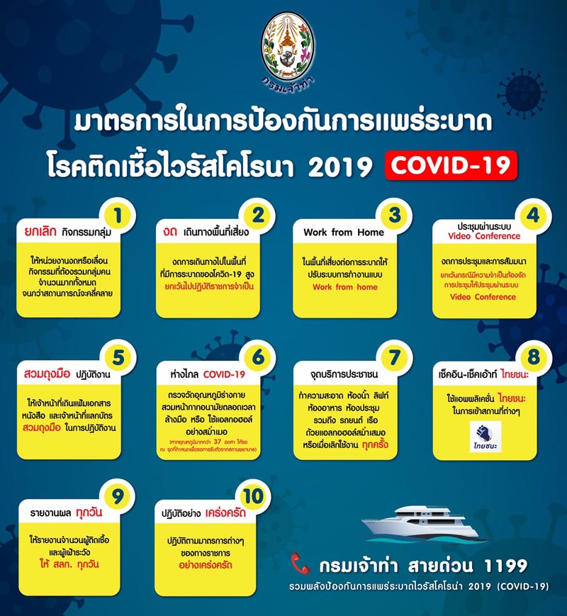 โดยกรมเจ้าท่าได้ออกประกาศกำหนดแนวทางในการเดินทางเข้าประเทศไทยสำหรับเจ้าของหรือ ผู้ครอบครองเรือ ผู้ประกอบการเดินเรือ ผู้ประกอบการท่าเรือนายเรือ ผู้ควบคุมเรือ คนประจำเรือและผู้โดยสาร เพื่อปฏิบัติตามมาตรการควบคุมการแพร่ระบาดของโรคติดเชื้อไวรัสโคโรนา 2019 (COVID -19) อย่างเข้มงวดตามประกาศ