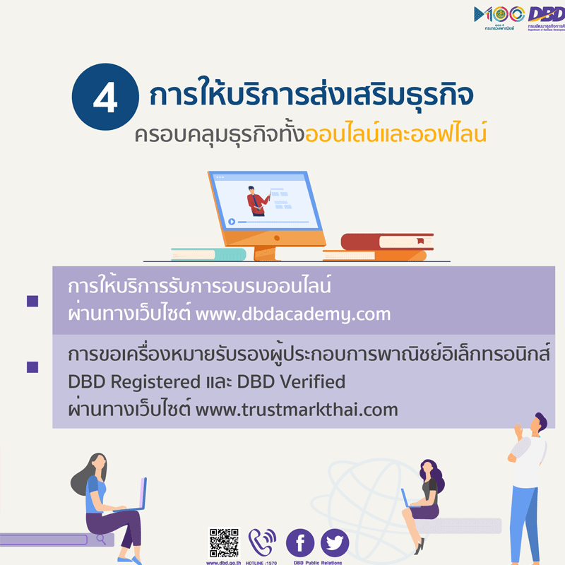 นายทศพล ทังสุบุตร อธิบดีกรมพัฒนาธุรกิจการค้า กระทรวงพาณิชย์ เปิดเผยว่า กรมฯ ได้พัฒนากระบวนการทำงานในส่วนของการให้บริการ เพื่อเป็นหน่วยงานดิจิทัลอย่างเต็มรูปแบบ ที่สามารถให้บริการได้ทุกที่ ทุกเวลา และอำนวยความสะดวกต่อผู้ประกอบธุรกิจและประชาชน โดยผู้ประกอบการสามารถใช้บริการกรมฯ ผ่านช่องทางออนไลน์ ทั้งการให้บริการจดทะเบียนธุรกิจ การให้บริการข้อมูล การให้บริการด้านงบการเงินของนิติบุคคล เพื่อหลีกเลี่ยงการพบปะหรือเข้าไปในหมู่คนจำนวนมาก ลดการสัมผัสใกล้ชิดกับกลุ่มเสี่ยงที่อาจไม่รู้จัก เป็นการป้องกันการแพร่กระจายของโควิด-19ได้ ซึ่งการให้บริการผ่านระบบออนไลน์ของกรมฯ อยู่ภายใต้การให้บริการแบบเบ็ดเสร็จ ณ จุดเดียวของกระทรวงพาณิชย์ (MOC Online One Stop Service)