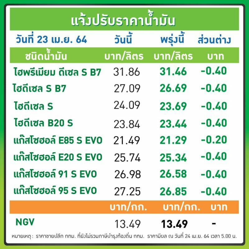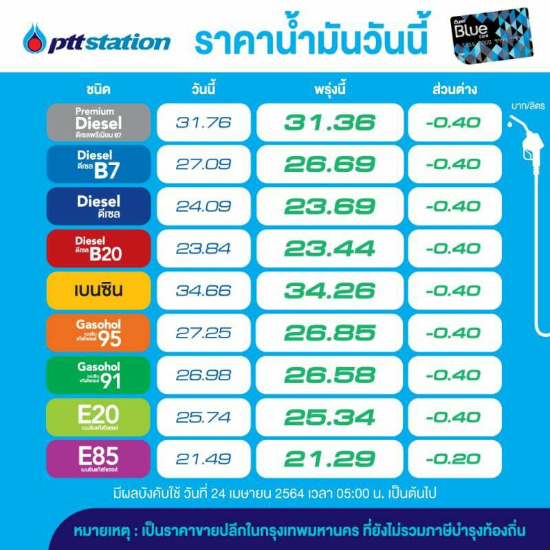 บมจ.ปตท.น้ำมันและการค้าปลีก (OR) และ บมจ.บางจาก คอร์ปอเรชั่น (BCP) ประกาศปรับลดราคาขายปลีก น้ำมัน ทุกชนิด 40 สต. เว้น E85 ลง 20 สต. มีผลพรุ่งนี้ 24 เม.ย. 2564 ตั้งแต่เวลา 05.00 น. เป็นต้นไป