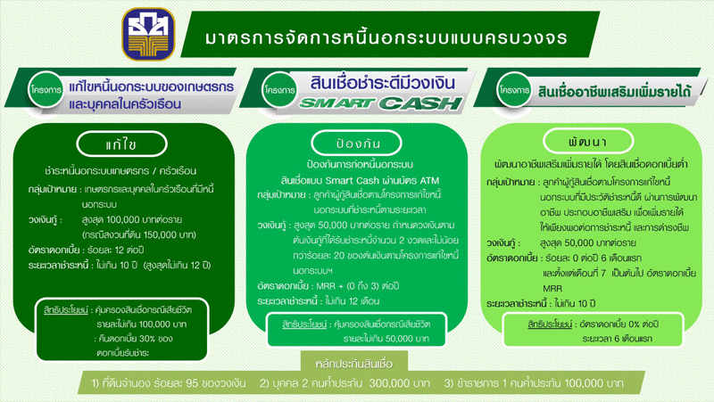 1) โครงการแก้ไขหนี้นอกระบบของเกษตรกรและบุคคลในครัวเรือน สำหรับชำระหนี้นอกระบบที่เกิดจากเกษตรกรลูกค้า คู่สมรส บุตร บิดามารดาของเกษตรกรลูกค้าหรือของคู่สมรสซึ่งอยู่ในอุปการะของเกษตรกรลูกค้า วงเงินกู้ไม่เกินรายละ 100,000 บาท เว้นแต่กรณีมีวัตถุประสงค์ในการสงวนที่ดินทำกินที่ลูกหนี้ใช้ที่ดินในการจำนองไม่เกินรายละ 150,000 บาท อัตราดอกเบี้ยร้อยละ 12 ต่อปี ระยะเวลาชำระหนี้ 10 ปี สูงสุดไม่เกิน 12 ปี พร้อมรับสิทธิประโยชน์ความคุ้มครองสินเชื่อกรณีเสียชีวิตรายละไม่เกิน 100,000 บาท และการคืนดอกเบี้ยในอัตราร้อยละ 30 ของดอกเบี้ยที่ชำระหนี้