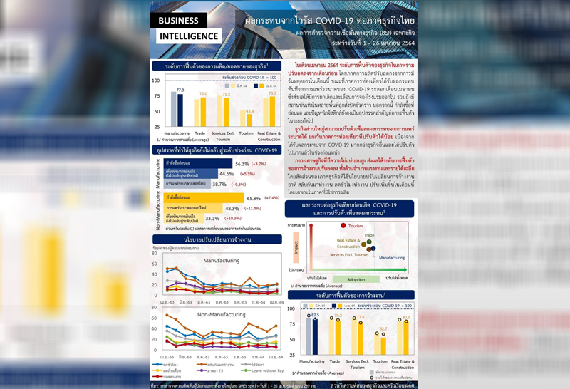 ธนาคารแห่งประเทศไทย รายงานสรุปผลสำรวจผลกระทบจาก COVID-19 ต่อภาคธุรกิจไทย ประจำเดือนเมษายน 2564 พบว่า ระดับการฟื้นตัวของธุรกิจในภาพรวมปรับลดลงจากเดือนก่อนหน้า โดยภาคการท่องเที่ยวได้รับผลกระทบจากการแพร่ระบาดของ COVID-19 ระลอกที่ 3 ทำให้ภาวะเศรษฐกิจที่มีความไม่แน่นอนสูงส่งผลให้ระดับการฟื้นตัวของการจ้างงานปรับลดลง ทั้งด้านจำนวนแรงงานและรายได้เฉลี่ย ในขณะที่ ผลสำรวจดัชนีความเชื่อมั่นผู้ประกอบการค้าปลีก เดือนเมษายน ปรับลดลงมาก หลังเกิดการแพร่ระบาดของ COVID-19 ที่เป็นวงกว้าง ขณะที่ความไม่ชัดเจนของแนวทางการฉีดวัคซีนกดดันความเชื่อมั่นในระยะต่อไป กำลังซื้อของผู้บริโภคแย่ลง รวมถึงความกังวลต่อมาตรการกระตุ้นการบริโภคที่ใกล้หมดลง ซึ่งจะส่งผลกระทบต่อการขยายตัวของการบริโภคเอกชนไตรมาส 2 นอกจากนี้ ผู้ประกอบการกว่าร้อยละ 60 ประเมินว่าผลกระทบจากการแพร่ระบาดและจำกัดเวลาขายของห้างถึง 21.00 น. จะส่งผลให้ยอดขายลดตัว