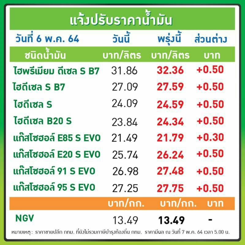 บมจ.ปตท.น้ำมันและการค้าปลีก (OR) และ บมจ.บางจาก คอร์ปอเรชั่น (BCP) ประกาศปรับขึ้นราคาขายปลีกน้ำมันทุกชนิด 50 สต. เว้น E85 ขยับ 30 สต.มีผลพรุ่งนี้ 7 พ.ค.2564 ตั้งแต่เวลา 05.00 น.เป็นต้นไป