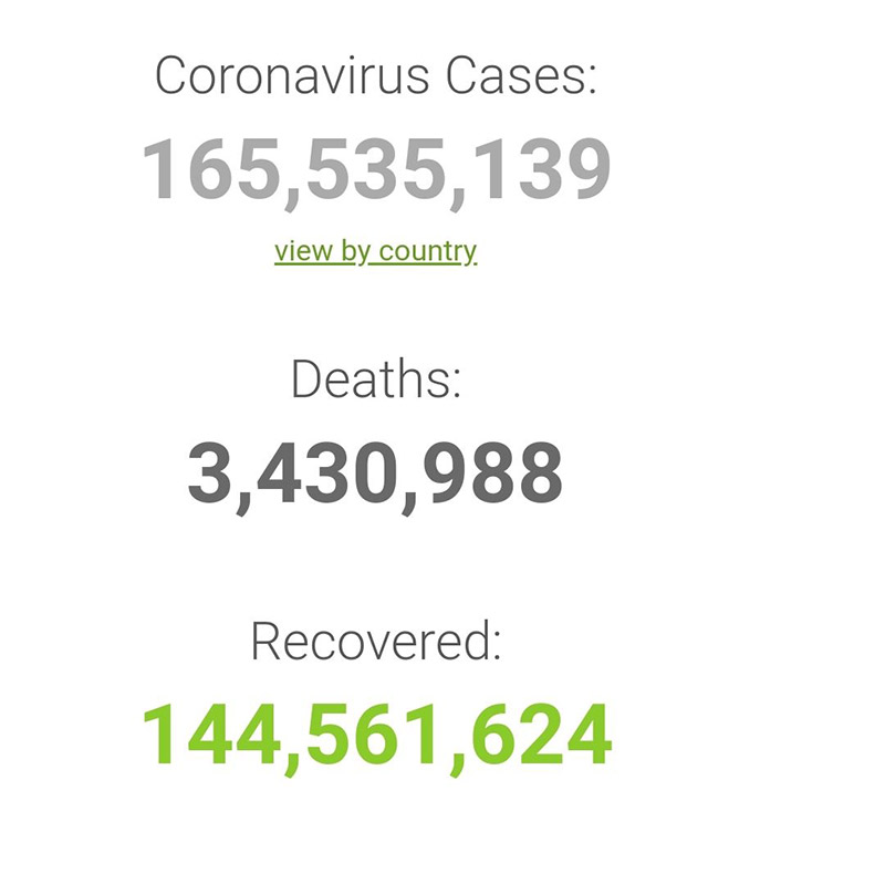 เว็บไซต์ worldometers รายงานสถานการณ์โควิด-19 ประจำวันที่ 20 พฤษภาคม 2564 ช่วงเวลาประมาณ 07.25 น.ตามเวลาประเทศไทย พบผู้ติดเชื้อทั่วโลกแล้ว 165,534,139 ราย เพิ่มขึ้น 649,566 ราย เสียชีวิต 3,430,988 ราย เพิ่มขึ้น 12,770ราย รักษาหาย 145,788,522ราย