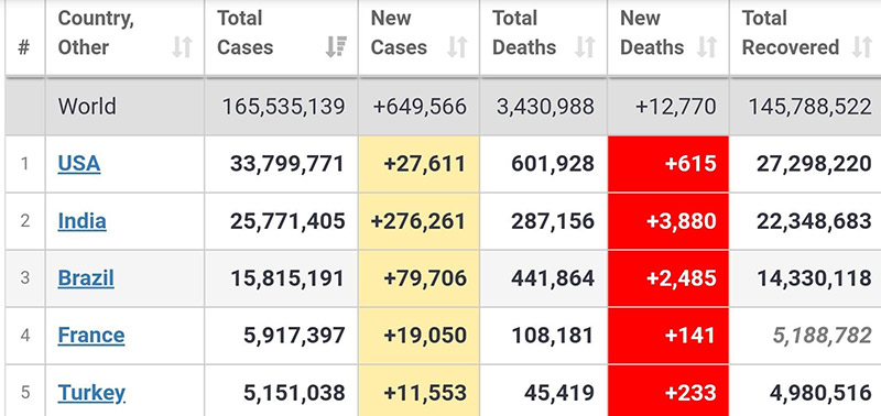 ทั่วโลกป่วยโควิด-19 กว่า 165 ล้านคน เพิ่มขึ้น 6.4 แสนคน อินเดีย – บราซิล ยังน่าห่วง ยอดคนป่วย-เสียชีวิตยังสูง