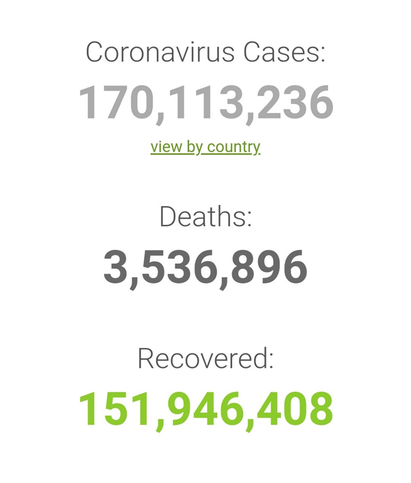 เว็บไซต์ worldometers รายงานสถานการณ์โควิด-19 ประจำวันที่ 29 พฤษภาคม 2564 ช่วงเวลาประมาณ 07.10 น. ตามเวลาประเทศไทย พบผู้ติดเชื้อทั่วโลกแล้ว 170,113,180 ราย เพิ่มขึ้น 496,204 ราย เสียชีวิต 3,536,894 ราย เพิ่มขึ้น 11,709 ราย รักษาหาย 152,094,814 ราย