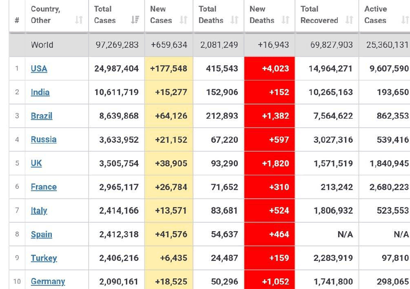 ทั่วโลกติดโควิดอีก 6.5 แสน สะสมกว่า 97 ล้านคน สหรัฐวันเดียวเพิ่ม 177,548 ราย – มาเลเชียป่วยอีก 4,008 ราย สะสมรวม 169,379 ราย