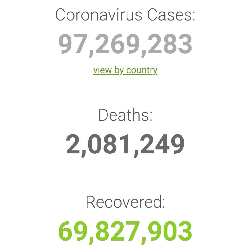 เว็ปไซต์ Worldometers รายงานสถานการณ์ของโรคโควิด-19 ประจำวันที่ 21 มกราคม 2564 ช่วงเวลาประมาณ 07.40 น. ตามเวลาประเทศไทย พบว่าทั่วโลกมีผู้ติดเชื้อ 97,269,283 ราย เพิ่มขึ้น 659,634 ราย เสียชีวิต 2,081,249 ราย เพิ่มขึ้น 16,943 ราย รักษาหาย 69,827,903 ราย