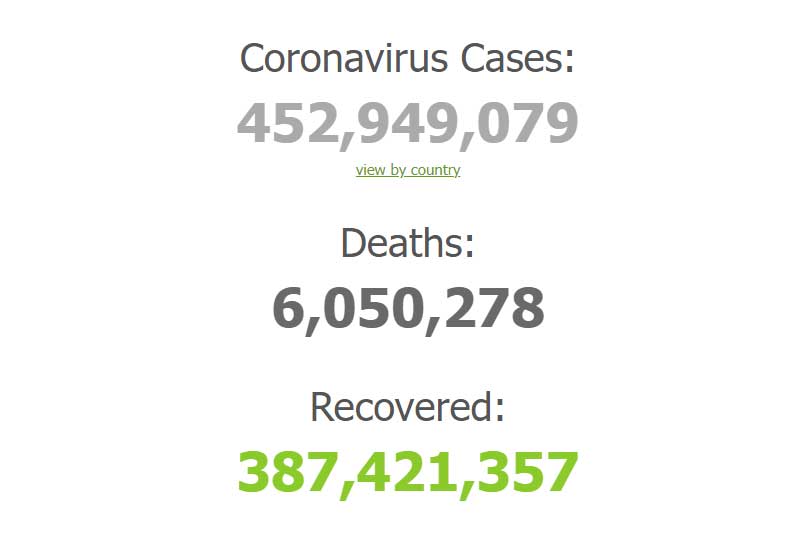 เว็บไซต์ Worldometers รายงานสถานการณ์ไวรัสโควิด-19 ประจำวันที่ 11 มีนาคม 2565 ช่วงเวลาประมาณ 06.40 น. ตามเวลาประเทศไทย พบมีผู้ป่วยติดเชื้อทั่วโลกรวม 452,932,531 ราย เพิ่มขึ้น 1,550,689 ราย เสียชีวิต 6,049,895 ราย เพิ่มขึ้น 5,994 ราย รักษาหาย 387,288,316 ราย เพิ่มขึ้น 1,480,726 ราย