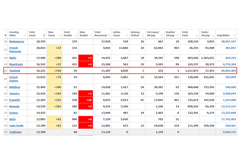 ส่วนประเทศไทย อยู่ในอันดับที่ 120 พบผู้ติดเชื้อ 16,221 ราย เพิ่มขึ้น 756 ราย เสียชีวิต 76 ราย รักษาหาย 11,287 ราย