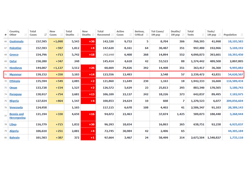 ขณะที่ประเทศเมียนมา อยู่ในอันดับที่ 71 พบผู้ติดเชื้อ 139,152 ราย เพิ่มขึ้น 350 ราย เสียชีวิต 3,103 ราย เพิ่มขึ้น 14 ราย รักษาหาย 123,556 ราย
