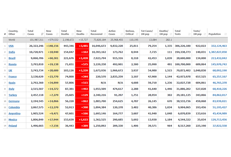 เว็บไซต์ Worldometers รายงานสถานการณ์ไวรัสโควิด-19 ประจำวันที่ 29 มกราคม 2654 ช่วงเวลาประมาณ 07.20น. ตามเวลาประเทศไทยพบมีผู้ป่วยติดเชื้อทั่วโลกแล้ว 101,987,311 ราย เพิ่มขึ้น 579,532 ราย เสียชีวิต 2,198,672 ราย เพิ่มขึ้น 15,727 ราย รักษาหาย 73,820,184 ราย