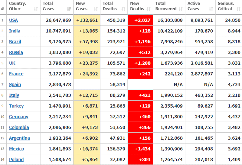1.สหรัฐอเมริกา พบผู้ติดเชื้อ 26,647,969 ราย เพิ่มขึ้น 132,661 ราย เสียชีวิต 450,319 ราย เพิ่มขึ้น 2,827 ราย รักษาหาย 16,303,889 ราย