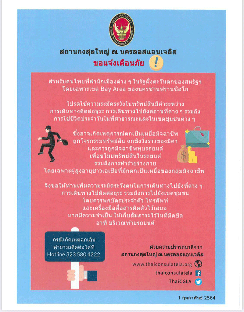 ดังนั้น สถานกงสุลใหญ่ไทยฯ ขอแจ้งเตือนคนไทยในรัฐฝั่งตะวันตกของสหรัฐฯ ทราบมาด้วยความห่วงใย และขอให้ทุกคนโปรดใช้ความระมัดระวังในทรัพย์สินมีค่าระหว่างการเดินทางติดต่อธุระ การเดินทางไปยังสถานที่ต่าง ๆ รวมถึงการใช้ชีวิตประจำวันในที่สาธารณะและในเขตชุมชนต่างๆ ทั้งนี้ ในกรณีที่มีเหตุเป็นเร่งด่วน สามารถติดต่อสถานกงสุลใหญ่ไทยฯ ได้ที่หมายเลขโทรศัพท์ Hotline (323) 580 4222 หรือทางอีเมล [email protected]