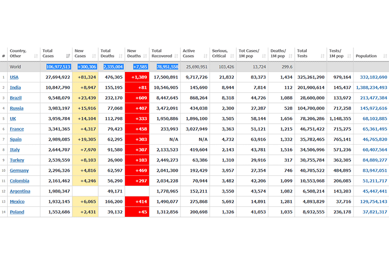 ทั่วโลกป่วยโควิด 106.9 ล้านคน เพิ่มขึ้น 3 แสน ตายเพิ่ม 7,585 -สหรัฐฯป่วยกว่า 27.6 ล้านคน มาเลเซีย เพิ่มอีก 3,100