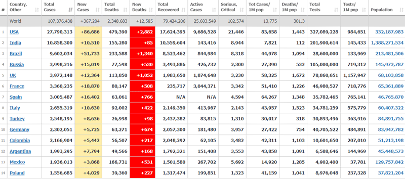 1.สหรัฐอเมริกา พบผู้ติดเชื้อ 27,790,313 ราย เพิ่มขึ้น 86,686 ราย เสียชีวิต 479,390 ราย เพิ่มขึ้น 2,882 ราย รักษาหาย17,624,395 ราย