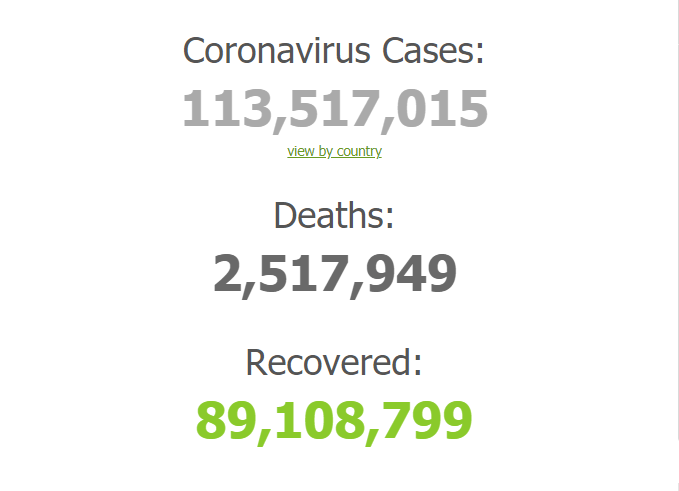 เว็บไซต์ Worldometers รายงานสถานการณ์โควิด-19 ประจำวันที่ 26 กุมภาพันธ์ 2564 ช่วงเวลาประมาณ 07.15 น.ตามเวลาประเทศไทย พบผู้ติดเชื้อทั่วโลกแล้ว 113,517,015 ราย เพิ่มขึ้น 428,063 ราย เสียชีวิต 2,517,949 ราย เพิ่มขึ้น 10,156 ราย รักษาหาย 89,108,799 ราย