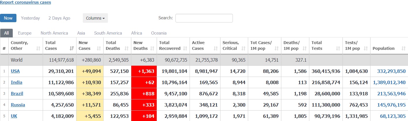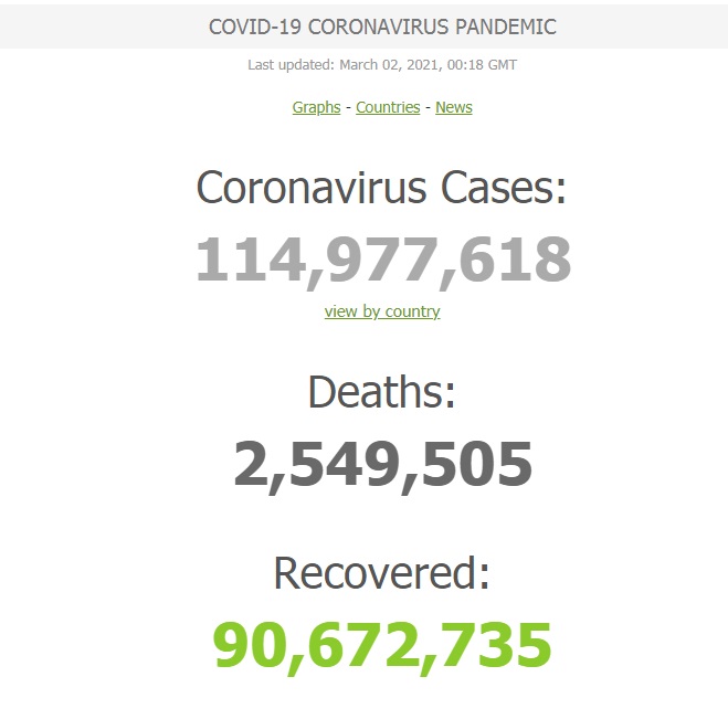 พบผู้ติดเชื้อทั่วโลกแล้ว 114,977,618 ราย เพิ่มขึ้น 280,860 ราย เสียชีวิต 2,549,505 ราย เพิ่มขึ้น 6,383 ราย รักษาหาย 90,672,735 ราย