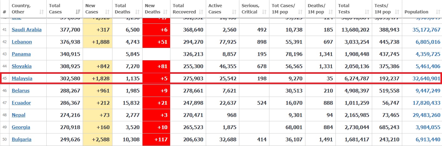 ขณะที่ประเทศมาเลเซีย อยู่ในอันดับที่ 45 มีผู้ติดเชื้อ 302,580 ราย เพิ่มขึ้น 1,828 ราย เสียชีวิต 1,135 ราย เพิ่มขึ้น 5 ราย รักษาหาย 275,903 ราย