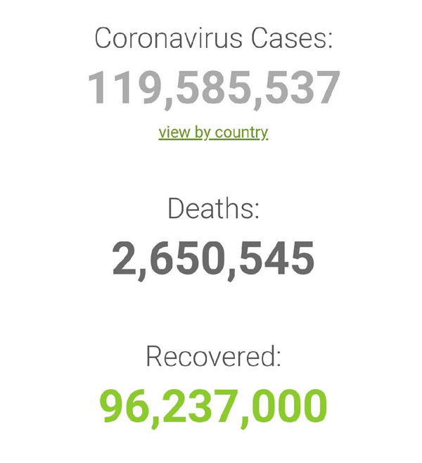เว็บไซต์ Worldometers รายงานสถานการณ์โควิด-19 ประจำวันที่ 13 มีนาคม 2564 ช่วงเวลาประมาณ 07.30 น.ตามเวลาประเทศไทย พบผู้ติดเชื้อทั่วโลกแล้ว 119,585,537 ราย เพิ่มขึ้น 476,742 ราย เสียชีวิต 2,650,545 ราย เพิ่มขึ้น 9,003 ราย รักษาหาย 96,237,000 ราย