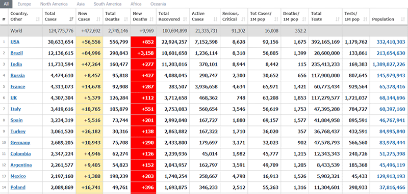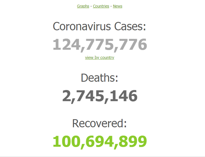 เว็บไซต์ Worldometers รายงานสถานการณ์โควิด-19 ประจำวันที่ 24 มีนาคม 2564 ช่วงเวลาประมาณ 07.25 น. ตามเวลาในประเทศไทย พบผู้ติดเชื้อทั่วโลกแล้ว 124,775,776 ราย เพิ่มขึ้น 472,692 ราย เสียชีวิต 2,745,146 ราย เพิ่มขึ้น 9,969 ราย รักษาหาย 100,694,899 ราย