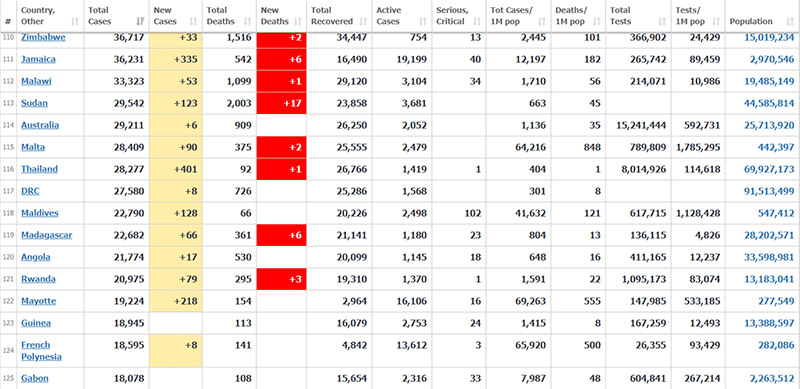 ส่วนประเทศไทย อยู่ในอันดับที่ 116 มีผู้ติดเชื้อ 28,277 ราย เพิ่มขึ้น 401 ราย เสียชีวิต 92 ราย เพิ่มขึ้น 1 ราย รักษาหาย 26,766 ราย