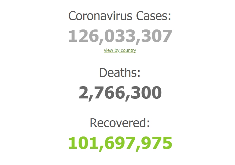 เว็บไซต์ Worldometers รายงานสถานการณ์โควิด-19 ประจำวันที่ 26 มีนาคม 2564 ช่วงเวลาประมาณ 07.20 น.ตามเวลาในประเทศไทยพบผู้ติดเชื้อทั่วโลกแล้ว 126,033,307 ราย เพิ่มขึ้น 607,177 ราย เสียชีวิต 2,766,300 ราย เพิ่มขึ้น 9,993 ราย รักษาหาย 101,697,975 ราย