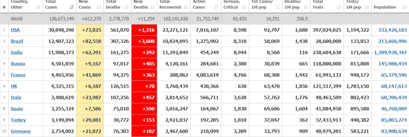ผู้ป่วยโควิดทั่วโลกเพิ่มขึ้น 612,270 ราย สะสม 126 ล้าน เสียชีวิต 2.7 ล้าน บราซิลยังอ่วม วันเดียวติดเชื้อ 82,558 ราย ตาย 3,600 ราย