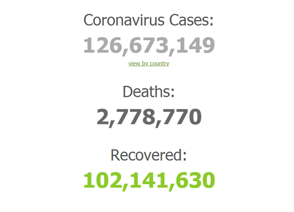 เว็บไซต์ Worldometers รายงานสถานการณ์โควิด-19 ประจำวันที่ 27 มีนาคม 2564 ช่วงเวลาประมาณ 07.26 น. ตามเวลาในประเทศไทย พบผู้ติดเชื้อทั่วโลกแล้ว 126,673,149 ราย เพิ่มขึ้น 612,270 ราย เสียชีวิต 2,778,770 ราย เพิ่มขึ้น 11,254 ราย รักษาหาย 102,141,630 ราย