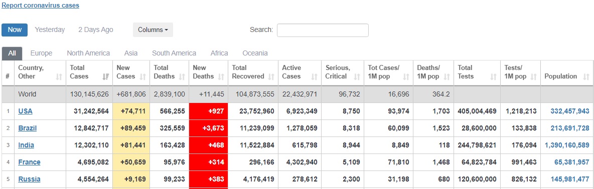 ทั่วโลกป่วยโควิด-19 เพิ่ม 6.8 แสนคน รวมสะสม 130 ล้านคน พบบราซิลวิกฤตวันเดียวพุ่งกว่า 8.9 หมื่น ส่วนอินเดียและอเมริกาก็ยังหนัก