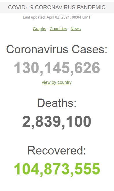 ติดเชื้อทั่วโลกแล้ว 130,145,626 ราย เพิ่มขึ้น 681,806 ราย เสียชีวิต 2,839,100 ราย เพิ่มขึ้น 11,445 ราย รักษาหาย 104,873,555 ราย