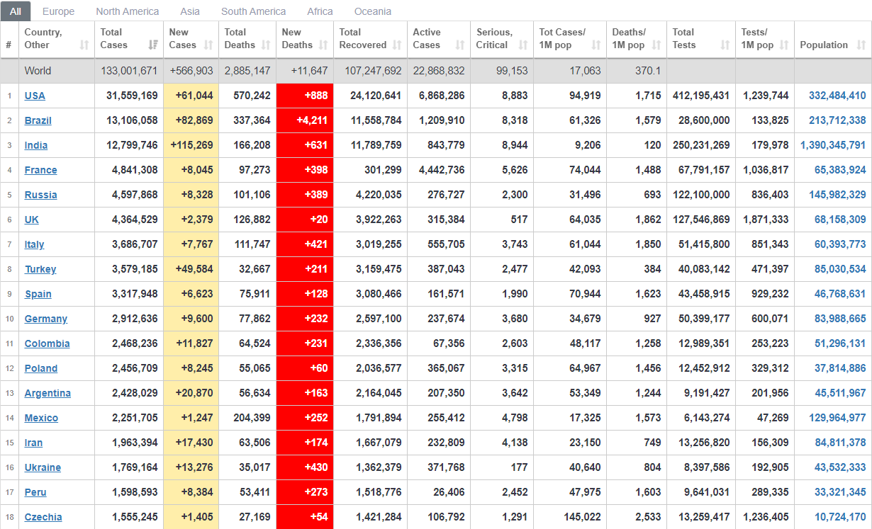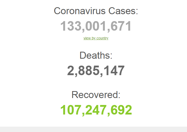 เว็บไซต์ Worldometers รายงานสถานการณ์โควิด-19 ประจำวันที่ 7 เมษายน 2564 ช่วงเวลาประมาณ 07.10 น.ตามเวลาในประเทศไทย พบผู้ติดเชื้อทั่วโลกแล้ว 133,001,671 ราย เพิ่มขึ้น 566,903 ราย เสียชีวิต 2,885,147 ราย เพิ่มขึ้น 11,647 ราย รักษาหาย 107,247,692 ราย