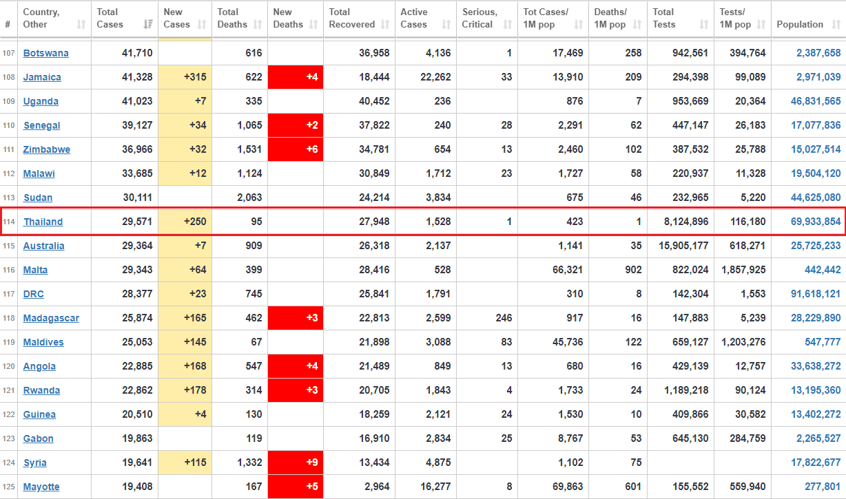 ส่วนประเทศไทย อยู่ในอันดับที่ 114 มีผู้ติดเชื้อ 29,571 ราย เพิ่มขึ้น 250 ราย ขยับขึ้นมา 1 อันดับ จากอันดับที่ 115 ส่วนยอดผู้เสียชีวิตอยู่ที่ 95 ราย รักษาหาย 27,948 ราย